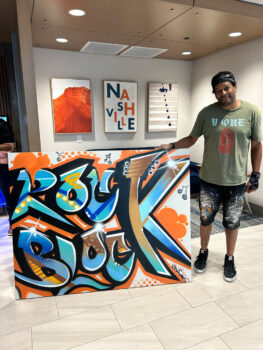 East Nashville-based graffiti artist Troy Duff created a custom art piece during the grand opening celebration that is now a permanent installation inside the hotel.