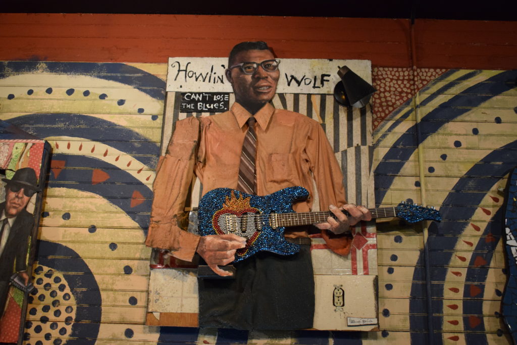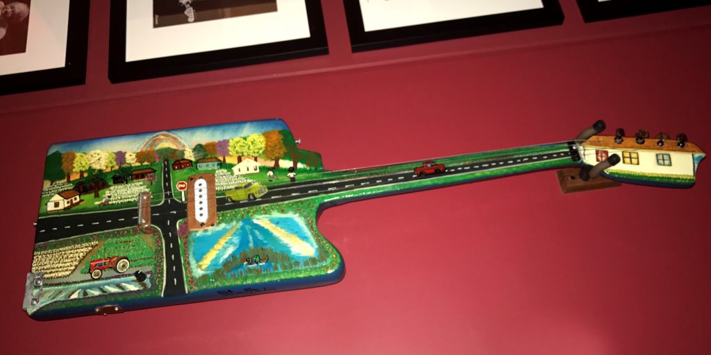 The most interesting guitar is the painted guitar: It’s a Didley Bo, handcrafted by James “Super Chickan” Johnson, the blues artist out of Clarksdale, MS. The folk art painted on the guitar depicts the famous crossroads in Clarksdale. He presented it to the theatre when it first re-opened.