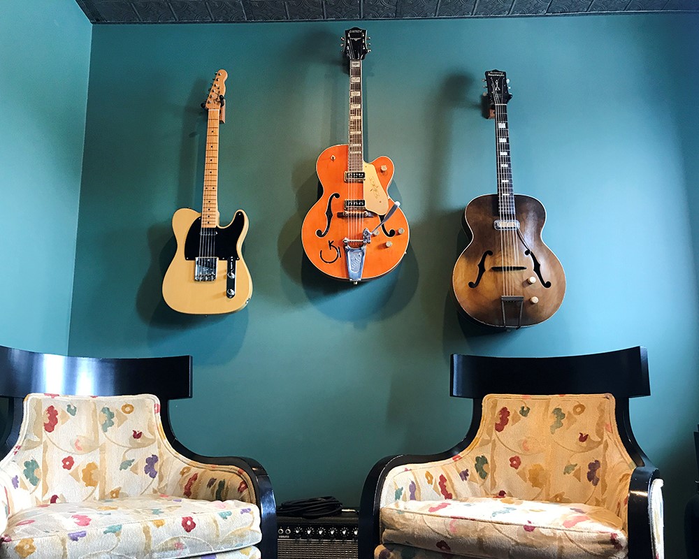 The three guitars in the green room were donated by friends of the theatre. Left to right – Fender Telecaster, Chet Atkins Gretsch and a Vintage Harmony Hollywood. The guitar strings are kept freshly strung and tuned for the artists and guests that come in who might want to play one.