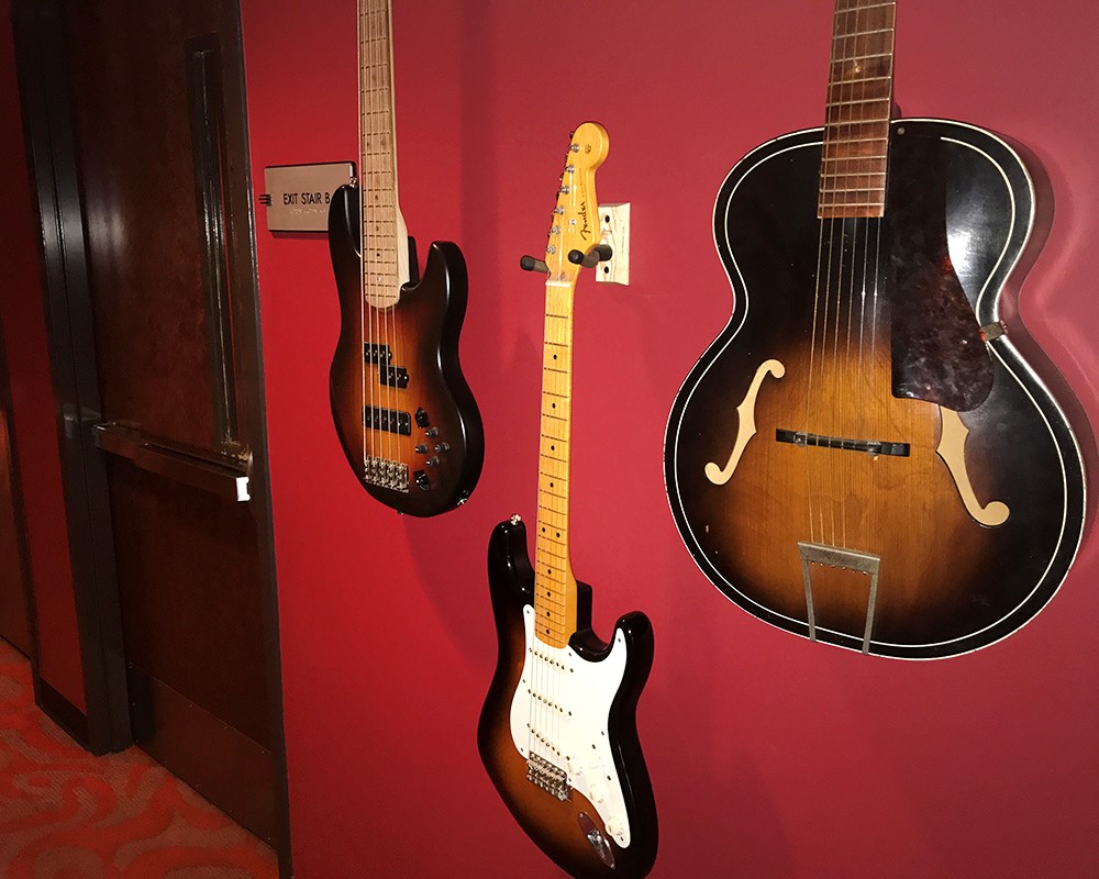 Just outside the green room are three guitars hanging in front of a “Wall of Fame” (where pictures of the artist that have performed here hang) Left to Right – Vintage Harmony Guitar, Fender Stratocaster and Alien Audio 5 String Bass made by a local luthier. Donated by friends of the theatre.