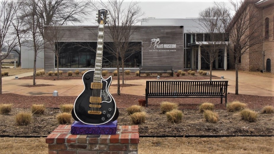 B.B. King played primarily on a Gibson semi-hollow body ES-355. He had a lot of them over the years, and every guitar was known as Lucille. Here is a statue of that guitar.