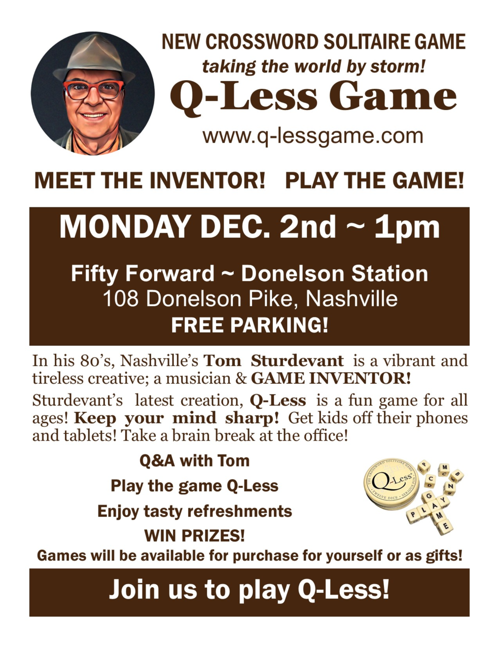 Inventor of the addictive crossword solitaire game, Tom Sturdevant has been a foreign service officer, a Peace Corps trainer, a farmer, a filmmaker, an award-winning game inventor, and most recently, a songwriter. When he retired from the game business, Q-Less was nothing more than a few handmade prototypes played by family and friends. Still, they all got hooked on the dice and word game, including Tom, who often played 20 or more times daily. So, in 2018 at age 75, Tom decided to “roll the dice” and return to the game business, sharing his “labor of love” with the world.