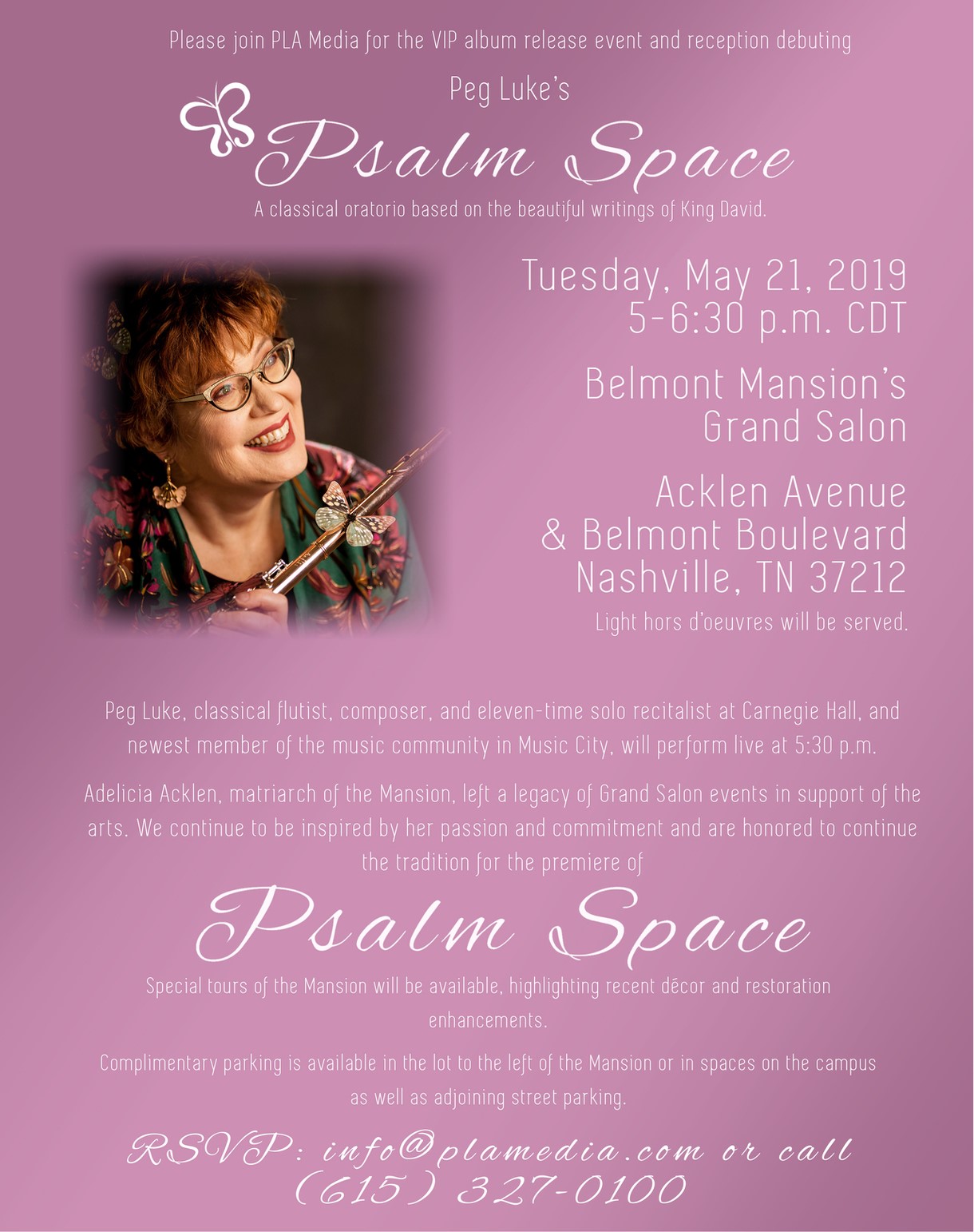 “Psalm Space” Album Release Party May 9, 2019 Events, Music Join PLA Media for the VIP album release of Peg Luke’s “Psalm Space” at the Belmont Mansion on Tuesday, May 21, 2019 at 5:00pm. RELATED POSTS No related posts.