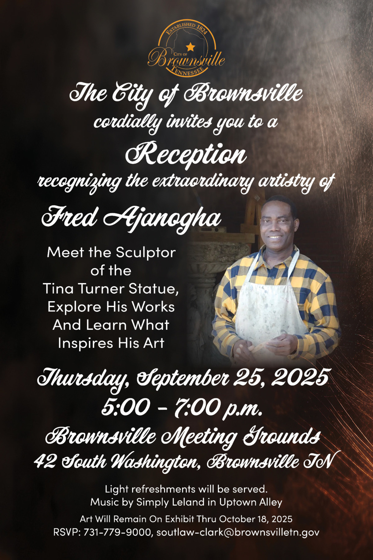Fred Ajanogha, who works as Ajano Art, the world-renowned artist who was commissioned by the City of Brownsville to sculpt the statue, will be honored at a reception on Thursday, September 25, 2025 from 5-7 pm where Ajano will give a short talk at the Brownsville Meeting Grounds (42 South Washington Ave) in downtown Brownsville, TN. Several of Ajano’s art pieces will be on display during this event and will remain until October 18, 2025 so the public can view some of the artist’s other works.